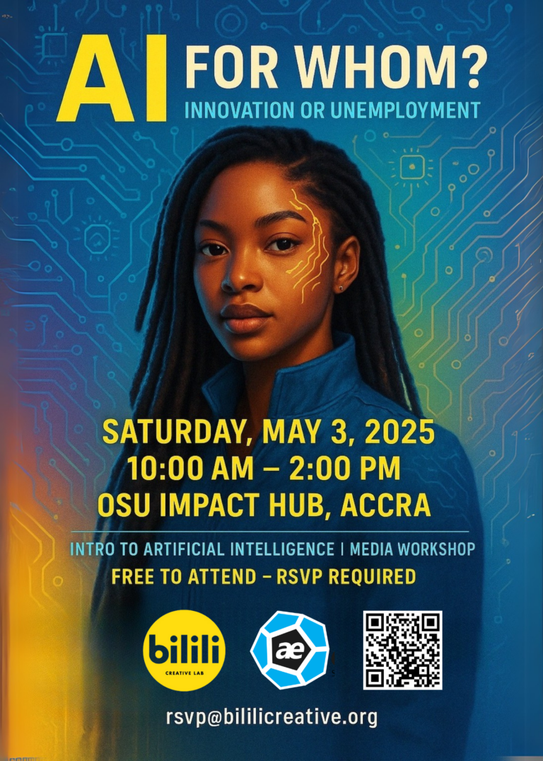 Join us for the “AI FOR WHOM? Innovation or Unemployment” workshop on Saturday, May 3, 2025, from 10:00 AM to 2:00 PM at Osu Impact Hub, Accra.